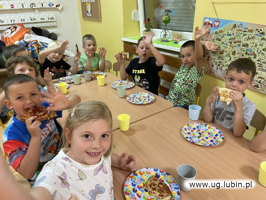 Na kolację wszyscy zjedli pizzę popijając herbatką. Oprócz tego na dzieci czekały niespodzianki, które przygotowały mamusie Tymka i Ninki- a były to przepyszne babeczki, ptysie z owocami sezonowymi oraz popcorn. Kolejną atrakcją była dyskoteka, podczas której stworzono playlistę z ulubionymi utworami przedszkolaków.