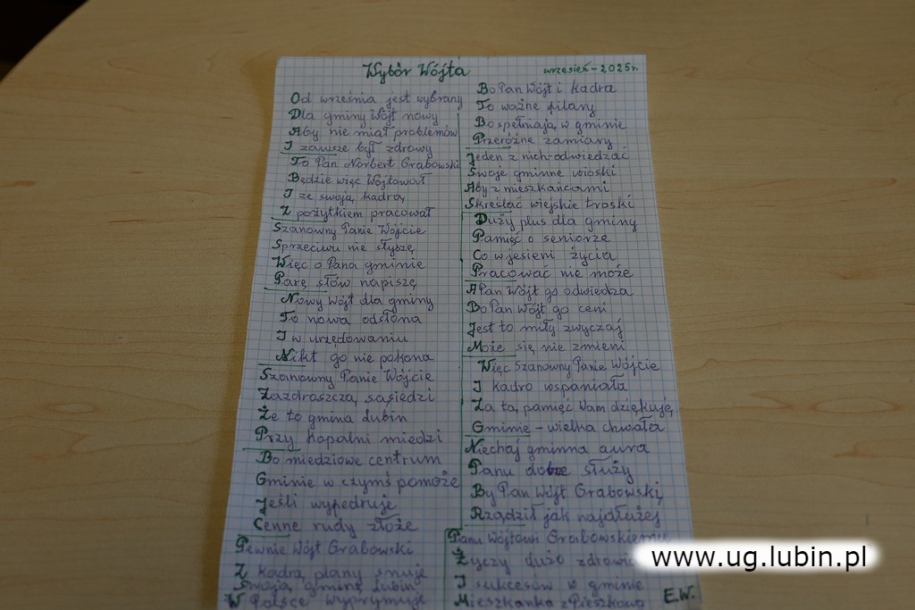 Na zakończenie jubileuszowego spotkania Jubilatka przeczytała specjalny wiersz dedykowany wójtowi Norbertowi Grabowskiemu, oto