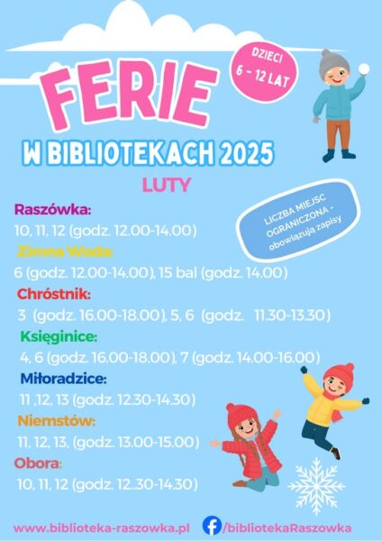 – Zapraszamy chętne dzieci w wieku od 6-12 lat na zajęcia czytelniczo-plastyczne przygotowane przez panie bibliotekarki w czasie ferii, które przypadają w tym roku dla naszego województwa od 3-16 lutego – mówi Wioletta Olech, dyrektor Gminnej Biblioteki Publicznej w Raszówce.