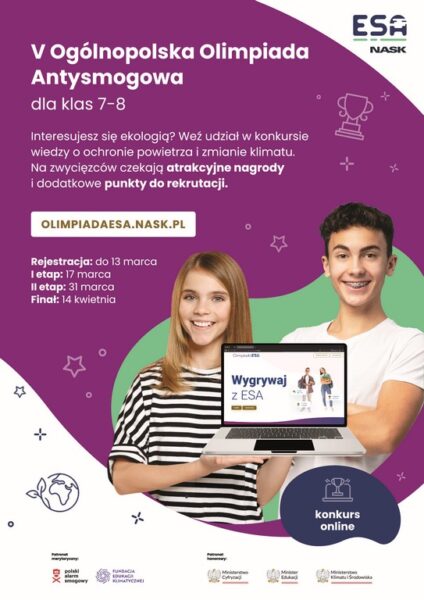 Państwowy Instytut Badawczy NASK organizuje V Ogólnopolską Olimpiadę Antysmogową dla uczniów z klas VII-VIII. Czasu na zgłoszenie się jest niewiele, a laureaci mogą liczyć na dodatkowe punkty w rekrutacji do szkół średnich. Dotychczas w olimpiadzie wzięło udział ponad 32 tysięcy uczniów.