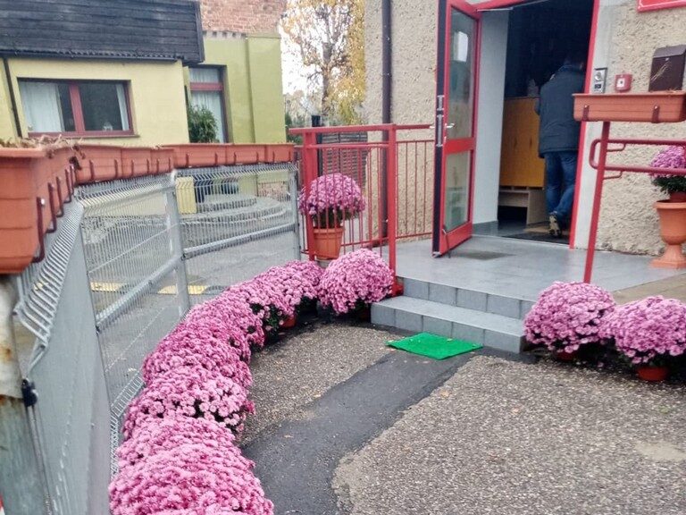 Piękne, kolorowe, jesienne chryzantemy mogą podziwiać najmłodsi i ich rodzice w drodze do Gminnego