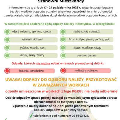 W dniach 17–24 października 2025 r. na terenie gminy Lubin zostanie przeprowadzony bezpłatny odbiór odpadów odzieży i tekstyliów bezpośrednio z nieruchomości zamieszkałych, których właściciele złożyli deklaracje na odbiór odpadów komunalnych.