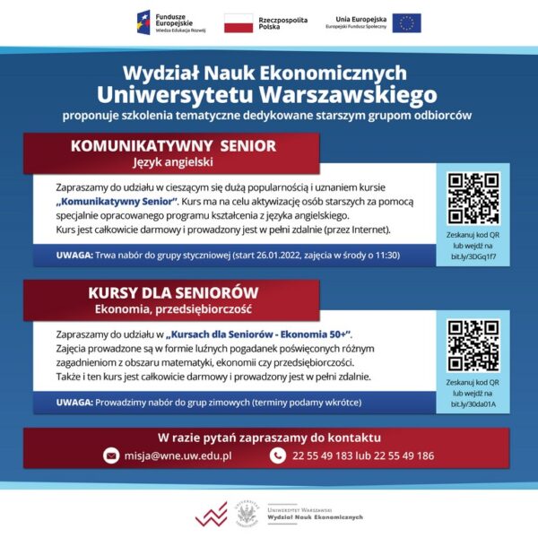 We współpracy z Wydziałem Nauk Ekonomicznych Uniwersytetu Warszawskiego zapraszamy do udziału w dwóch szkoleniach tematycznych  dedykowanych seniorom. Trwają nabory do kursu językowego oraz szkolenia z szeroko pojętej ekonomii.
