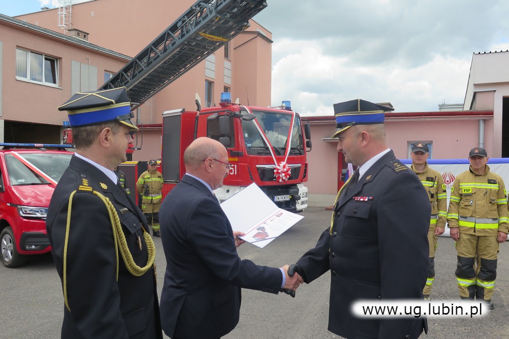 Strażacy natomiast dziękowali za udzielne wsparcie finansowe. Uroczystość była także okazją do przekazania jednostce samochodu specjalnego z drabiną mechaniczną oraz lekkiego samochodu kwatermistrzowskiego, którego zakup współfinansowała gmina Lubin. O wsparciu służb pożarniczych przez gminny samorząd napiszemy więcej w kolejnym materiale.
