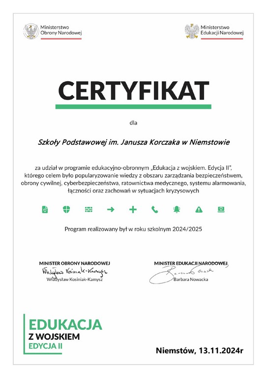 W Szkole Podstawowej im. J. Korczaka w Niemstowie realizowany jest programu Ministerstwa Obrony Narodowej, którego celem jest podniesienie świadomości dzieci i młodzieży w obszarze bezpieczeństwa i obronności.