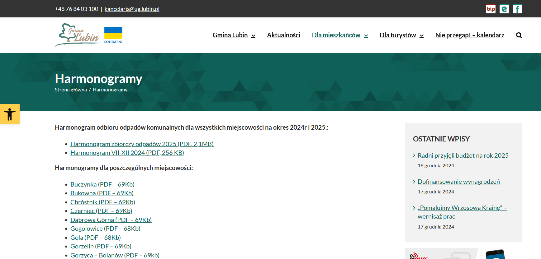 Jak co roku, w zakładce „Dla mieszkańców – odpady – harmonogramy” opublikowane zostały planowane daty odbiory odpadów komunalnych w roku 2025. Dla ułatwienia przygotowano zarówno zbiorczy harmonogram, jak i pojedyncze terminarze dedykowane mieszkańcom poszczególnych sołectw. Tradycyjnie harmonogramy będą wydrukowane także w styczniowym wydaniu Wiadomości Gminnych.