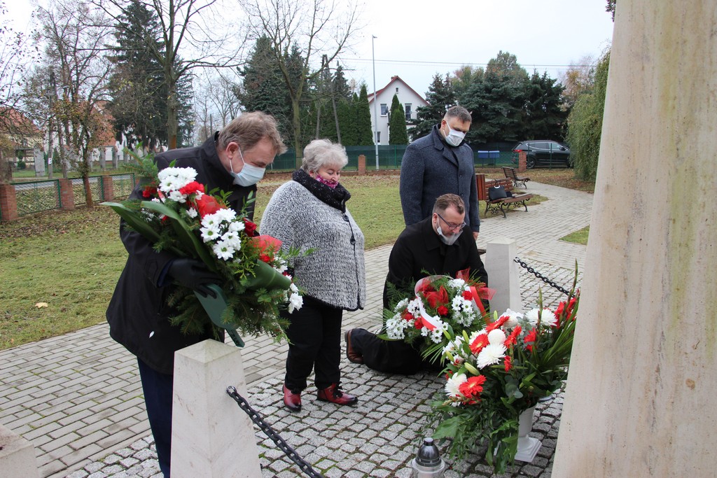 Wójt Tadeusz Kielan, proboszcz Paweł Kajl, sołtys Alina Majewska i przewodniczący Rady Gminy Norbert Grabowski składają kwiaty pod tablicą pamięci Józefa Piłsudskiego.