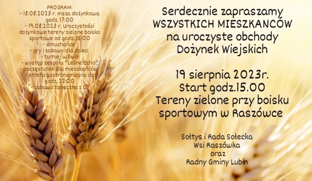 Sołectwa Raszówka, Gogołowice i Niemstów zapraszają swoich mieszkańców już jutro na spotkania dożynkowe. Tym samym w gminie Lubin rozpoczyna się, trwający aż do 16 września cykl spotkań, zabaw i festynów, których głównym celem jest podziękowanie za plony oraz integracja lokalnych społeczności.