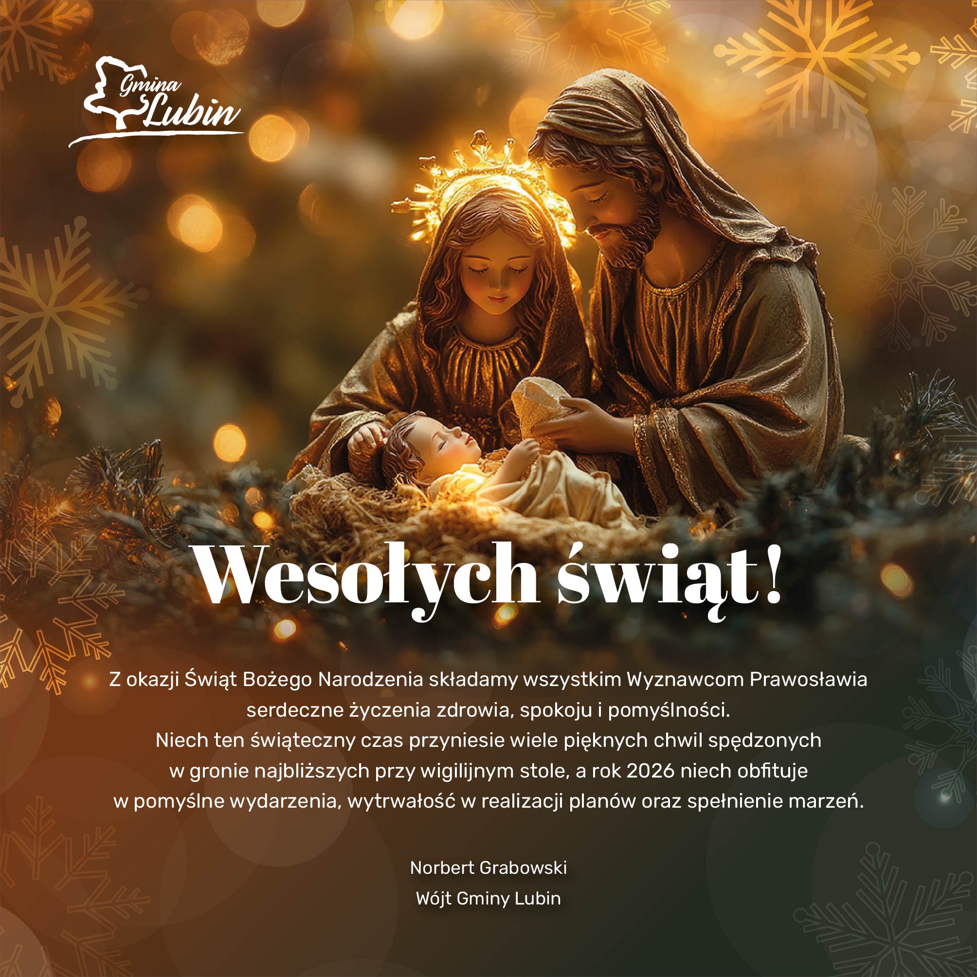 Wigilijny wieczór rozpocznie świąteczny czas Bożego Narodzenia. To moment wyczekiwany, przeżywany w gronie najbliższych, w ciszy, skupieniu i zgodnie z przekazywaną z pokolenia na pokolenie tradycją. Z myślą o mieszkańcach naszej gminy, którzy właśnie teraz wchodzą w ten szczególny czas, przekazujemy od wójta życzenia spokoju i dobra.