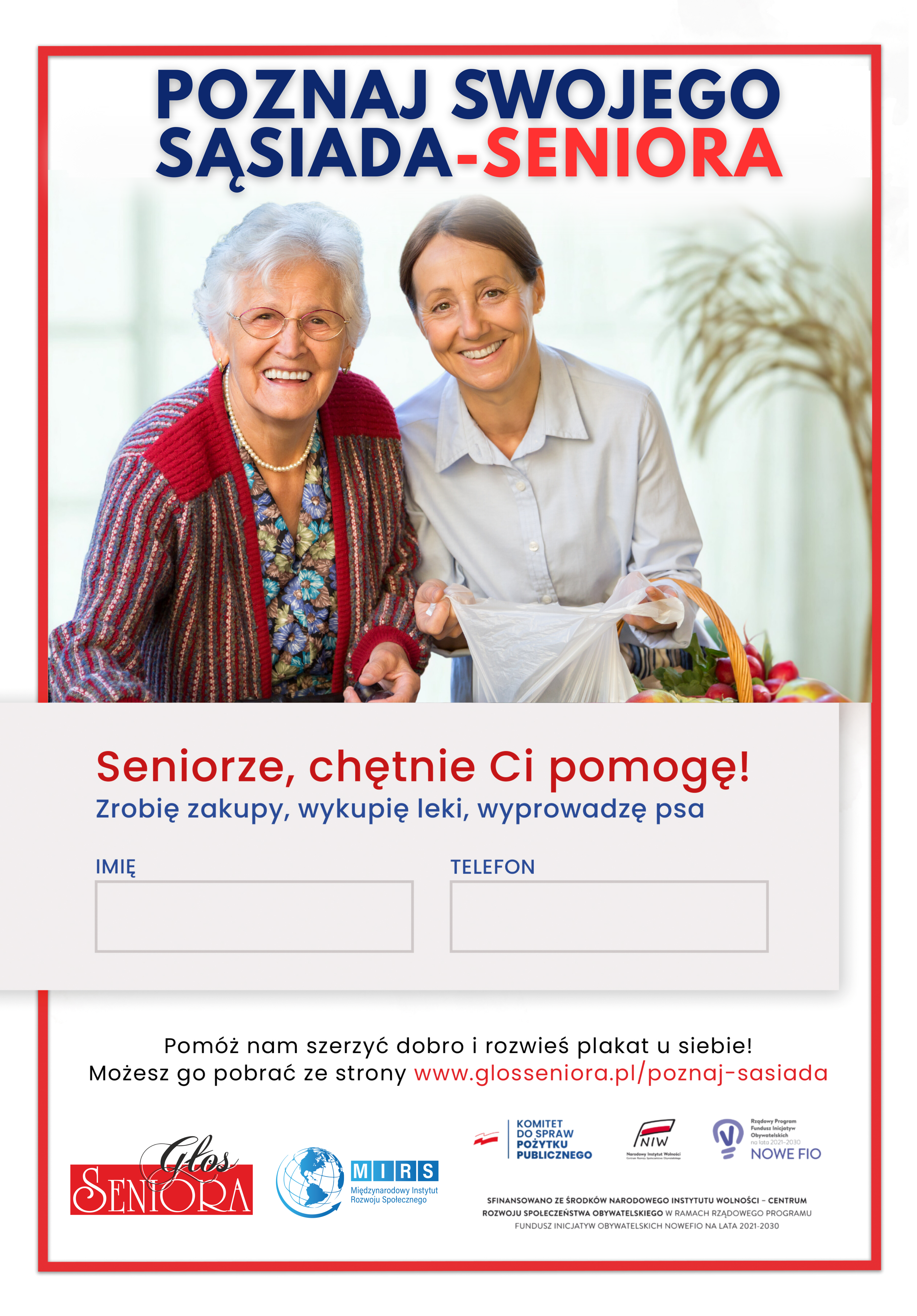 Oprócz konkursów skierowanych dla seniorów, zachęcamy młodzież uczestniczącą w szkolnych wolontariatach do akcji ,,Poznaj swojego sąsiada – seniora”. Ma ona wesprzeć seniorów, którzy potrzebują pomocy w zrobieniu zakupów, wykupieniu leków oraz innych codziennych czynnościach. Taka międzypokoleniowa współpraca może posłużyć wymianie ciekawych życiowych historii i doświadczeń, z których czerpać będą obie strony. Uwrażliwi to również młodych ludzi na problemy z jakimi mierzą się seniorzy.