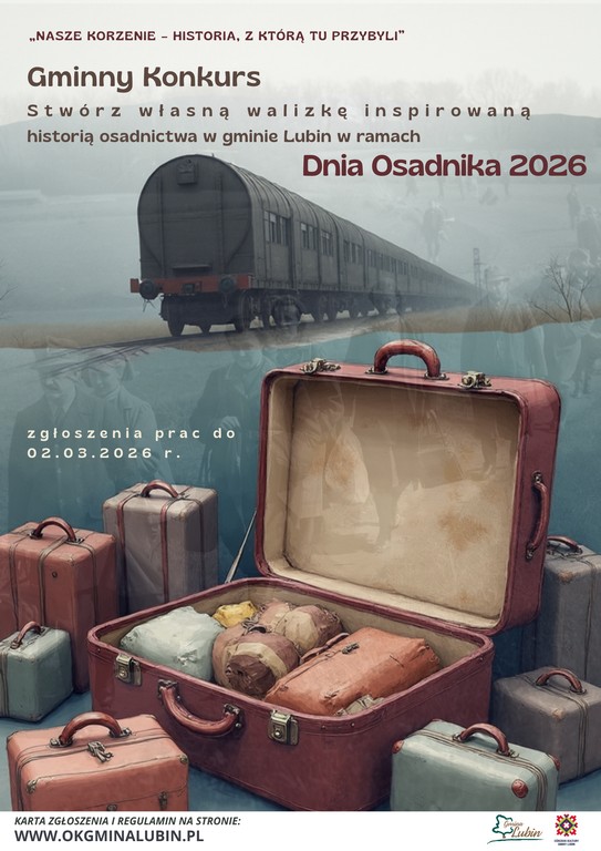 „Stwórz własną walizkę inspirowaną historią osadnictwa w gminie Lubin” to konkurs o twórczy i narracyjnym charakterze. Zadaniem uczestników jest stworzenie przestrzennej pracy plastycznej w formie walizki, symbolizującej drogę, podróż i początki nowego życia osadników na terenie gminy Lubin. Walizka może zawierać przedmioty, symbole, ilustracje lub opowieści odnoszące się do: