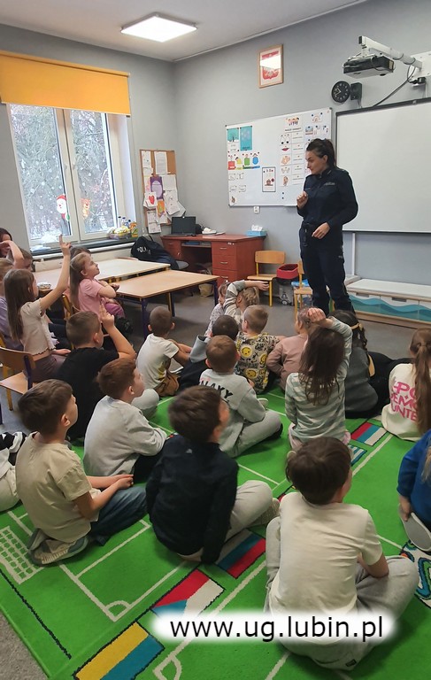 Dzieci z przedszkola oraz pierwszej klasy spotkały się z policjantką, która w ciekawy i przystępny dla nich sposób opowiedziała o zasadach bezpieczeństwa podczas ferii zimowych. Było dużo pytań, wskazówek i uśmiechów. Po takim spotkaniu już na początku ferii wszyscy poczuli się gotowi na nadchodzący odpoczynek.