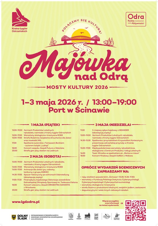 Wydarzenie „Mosty Kultury 2026” to połączenie pasji do rzeki z Festiwalem Produktów Lokalnych. Centralnym punktem programu będą rejsy statkiem pasażerskim „Ścinawa” w godz. 13:30, 15:30, 17:30 oraz widowiskowe spływy kajakowe: Dolnośląska Olimpiada Sportowa im. Tadeusza Kielana (2 maja) oraz patriotyczny, Biało-Czerwony (3 maja).