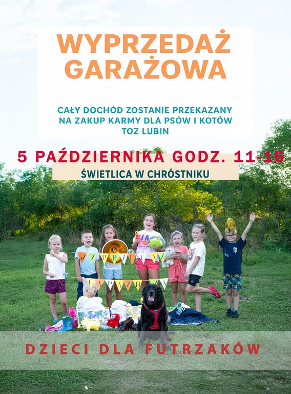 Już 5 października odbędzie się wyjątkowa wyprzedaż garażowa zorganizowana przez dzieci z naszej gminy. Dochód ze sprzedaży zostanie przeznaczony na zakup karmy dla zwierząt pod opieką TOZ Lubin. To dowód na to, że wielkie serce nie ma wieku, a dzieci z pomocą rodziców potrafią zrobić coś naprawdę ważnego.