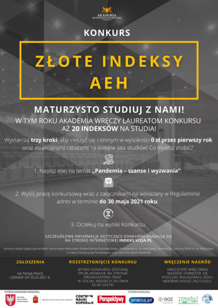 Prace konkursowe o objętości nie mniejszej niż 3000 słów i nie większej niż 8000 słów należy przesłać wraz ze wszystkimi załącznikami na adres AEH w Warszawie do 30 maja 2021 roku. Wyniki konkursu zostaną ogłoszone najpóźniej 30 czerwca 2021 roku, natomiast uroczyste wręczenie dyplomów oraz indeksów odbędzie się podczas Inauguracji Roku Akademickiego 2021/2022 z zachowaniem zasad reżimu sanitarnego.