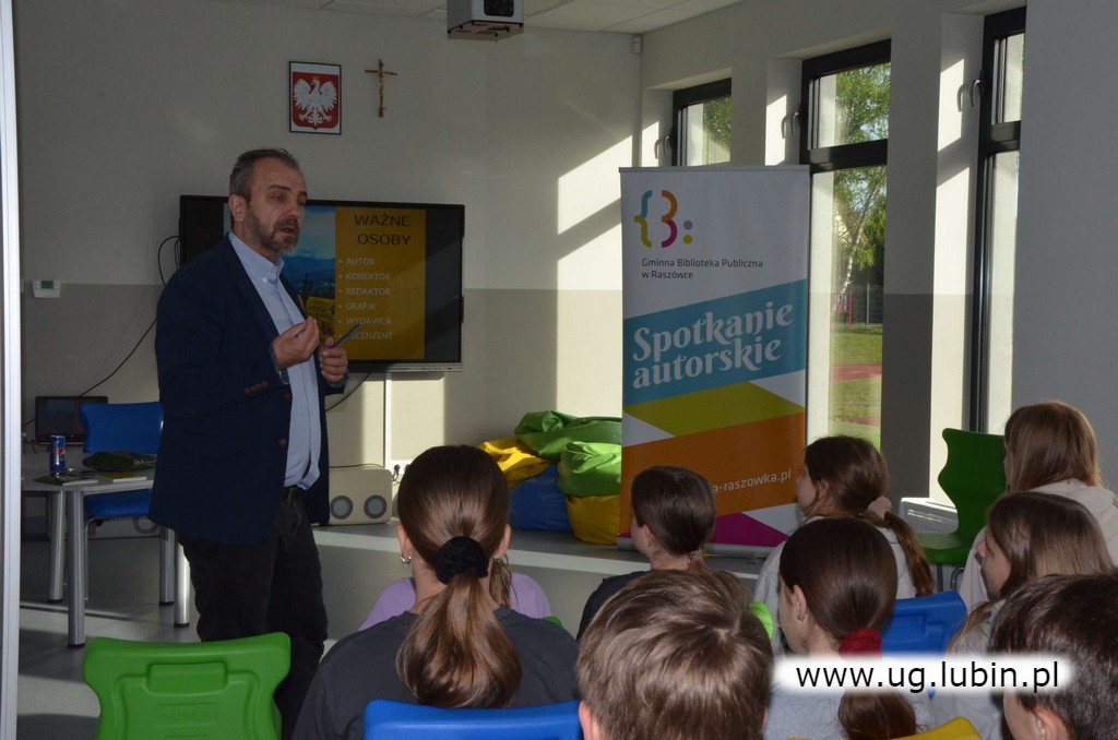 Gminna Biblioteka Publiczna w Raszówce zaprosiła uczniów klas 4-5 szkół podstawowych gminy Lubin do udziału w projekcie szkoleniowym dotyczącym powstawania książki. Zajęcia poprowadził autor serii książek przygodowo-podróżniczych dla dzieci o przygodach nastoletniej Zuzi na trzech kontynentach – Przemysław Jakóbczyk.