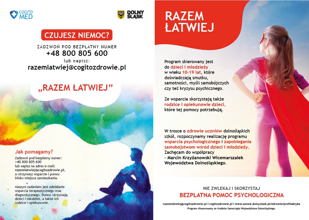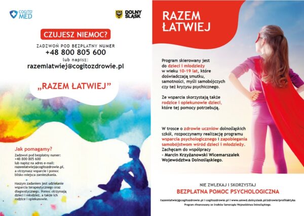 Urząd Marszałkowski Województwa Dolnośląskiego uruchomił specjalny numer telefonu i program, który ma pomagać dzieciom. Stworzono „Program polityki zdrowotnej w zakresie profilaktyki zaburzeń psychicznych, w tym depresji oraz zapobiegania samobójstwom dla dzieci i młodzieży na terenie województwa dolnośląskiego” na lata 2023-2025. Jego realizatorem wyłonionym w trybie konkursowym został podmiot wykonujący działalność leczniczą – Cogito Sebastian Łaźniak.