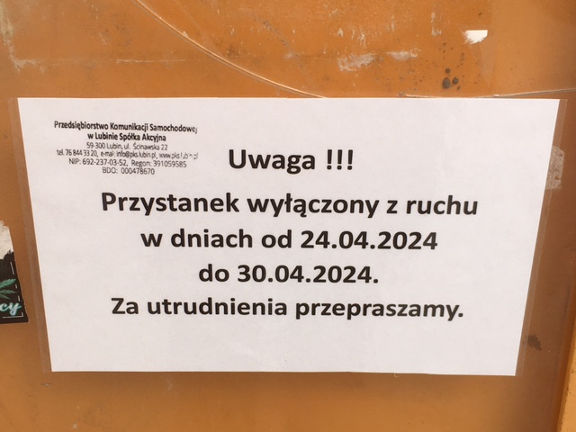 Informujemy, że w związku z przebudową odcinka drogi gminnej w miejscowości Kłopotów konieczne stało się czasowe wyłączenie jej z użytkowania. W związku z tym w czasie trwania robót drogowych, w okresie od 24 do 30 kwietnia 2024 r. zostanie zmieniona trasa kursowania autobusów linii nr 4 Lubińskich Przewozów Pasażerskich.