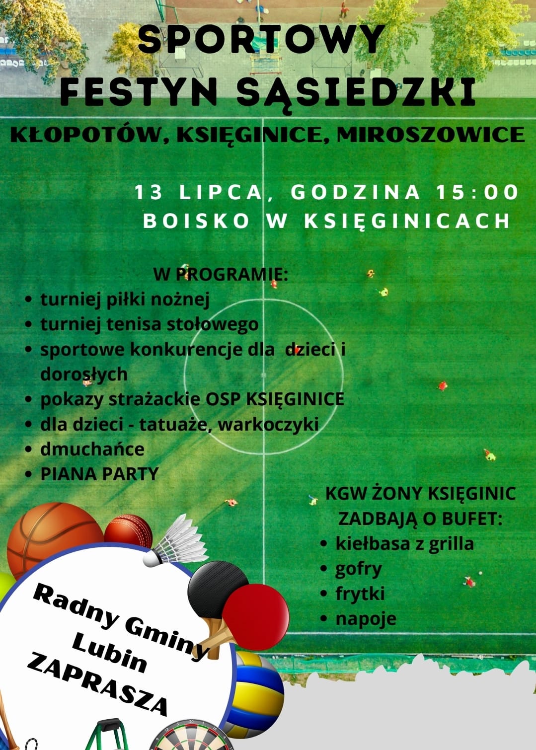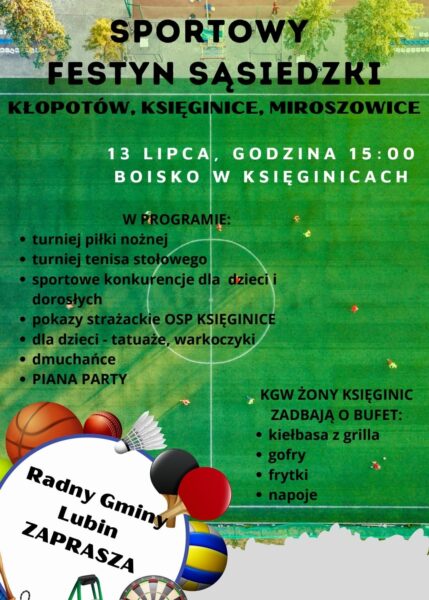 Radny Łukasz Szymański zaprasza mieszkańców trzech sołectw na dzień że sportem. W najbliższą sobotę na boisku w Księginicach organizowany jest specjalny festyn dla mieszkańców Księginic i ich sąsiadów z Kłopotowa i Miroszowic.