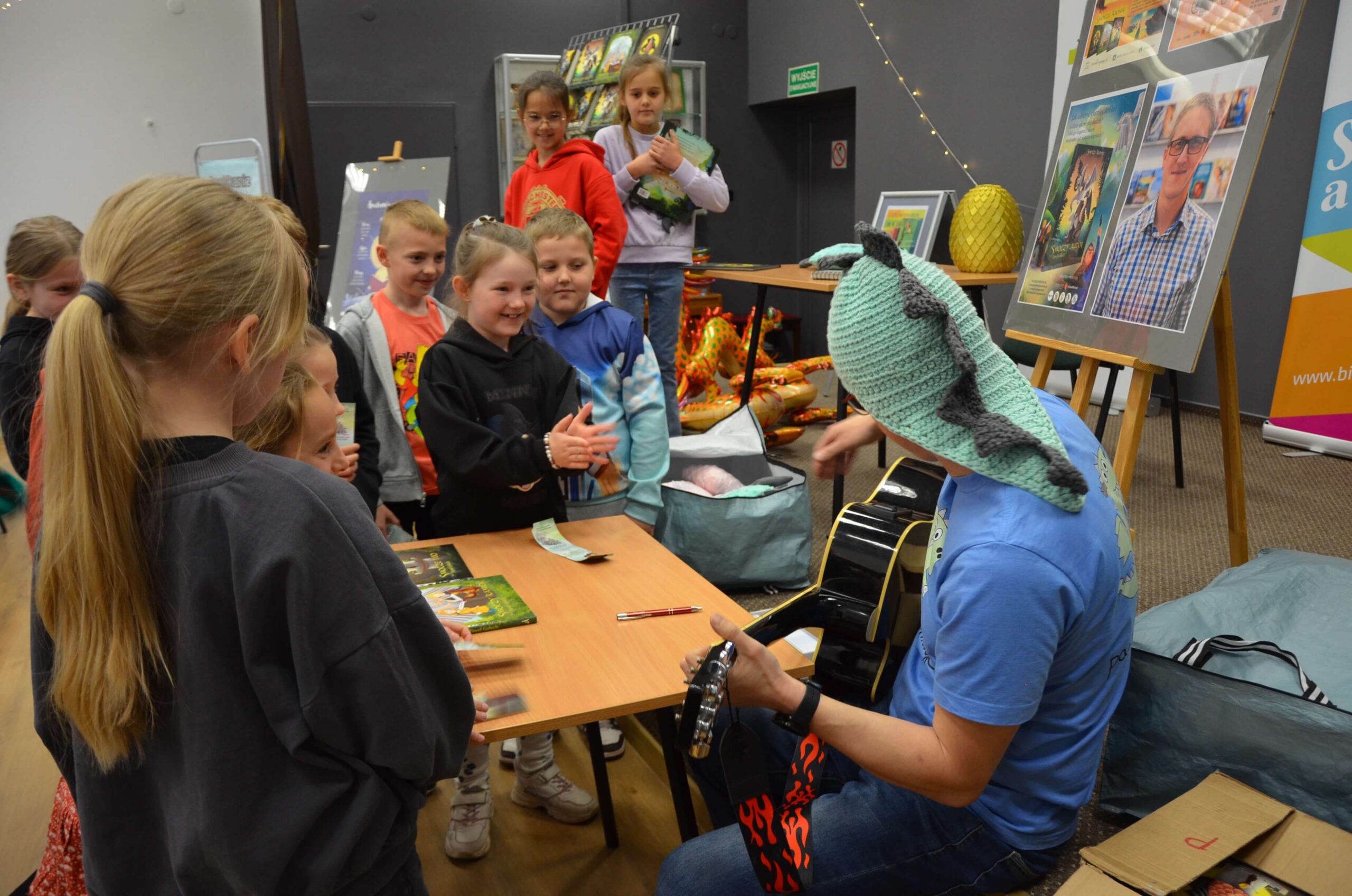 Nie zabrakło też muzyki i… rekwizytów! Pisarz zagrał na gitarze, opowiadał anegdoty, a każde dziecko otrzymało pamiątkową zakładkę do książki. Hasło tegorocznego święta – „Wolność wyobraźni” – zostało zrealizowane w stu procentach!