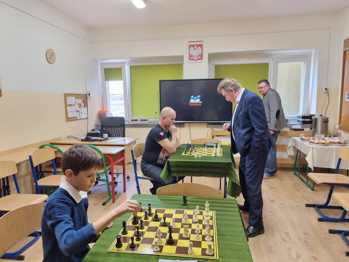 Radny wyszedł z propozycją, by zamiast jednej rozgrywki, przygotować symultanę z udziałem ucznia szkoły, w którego imieniu licytowała mama. I w ten sposób Mateusz Różycki z IV klasy wraz z sołtysem Jerzym Tadlą rzucili wyzwanie wójtowi.