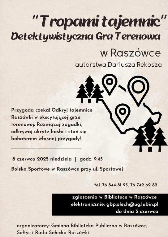 To będzie niedziela pełna zagadek, przygód i wspólnej zabawy na świeżym powietrzu! Gminna Biblioteka Publiczna w Raszówce oraz sołtys i rada sołecka Raszówki zapraszają mieszkańców gminy Lubin do udziału w wyjątkowej, detektywistycznej grze terenowej „Tropami tajemnic”, autorstwa Dariusza Rekosza – znanego pisarza i animatora kultury.