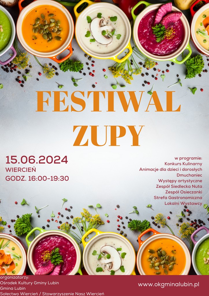W imieniu Ośrodka Kultury Gminy Lubin, Mieczysława Hubki  sołtysa wsi Wiercień, rady sołeckiej oraz Stowarzyszenia Nasz Wiercień zapraszamy  na druga edycję Festiwalu Zupy. Start o godzinie 16!