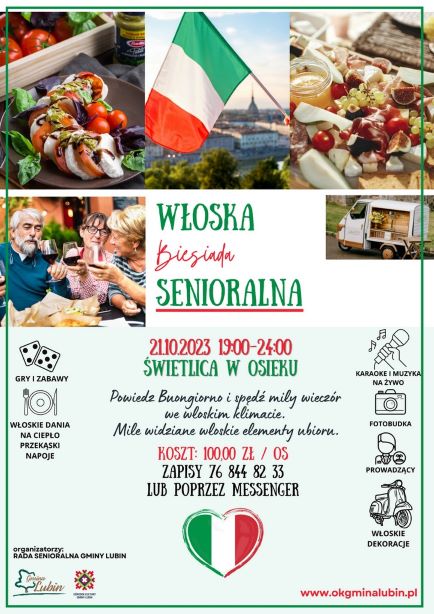 Już w najbliższą sobotę zapraszamy Was na wyjątkową biesiadę we włoskim stylu, która odbędzie się w świetlicy wiejskiej w Osieku. To wydarzenie pełne smaku, muzyki i wspaniałych wspomnień, które na pewno umili Wam wieczór!