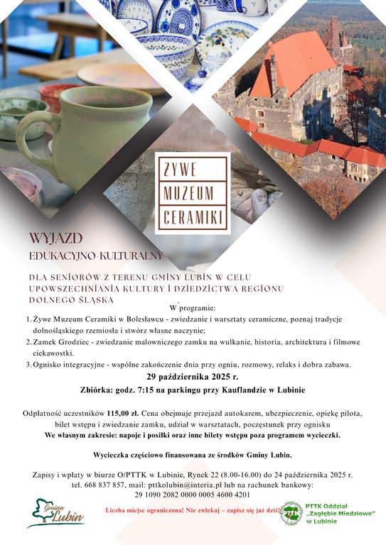 Zachęcamy seniorów z terenu gminy Lubin do udziału w wycieczce, którą zaplanowano na 29 października 2025 r. Jej celem jest upowszechnienia kultury i dziedzictwa Dolnego Śląska. Uczestnicy będą mieli okazję zwiedzić dwa atrakcyjne miejsca i wziąć udział w ognisku integracyjnym. Ilość miejsc ograniczona.