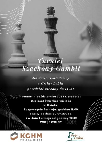 Już w najbliższą sobotę, 4 października 2025 roku, w świetlicy wiejskiej w Osieku odbędzie się Gminny Turniej Szachowy „Gambit”. To wyjątkowe wydarzenie podsumuje całoroczne szkolenia prowadzone w ramach projektu „Gambit” i będzie okazją, by spotkać się przy szachownicy w atmosferze sportowej rywalizacji i dobrej zabawy.