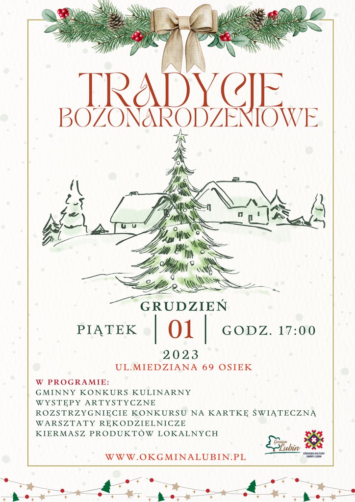 Przed nami jedna z najsmaczniejszych i wyjątkowych imprez w roku. Tradycje Bożonarodzeniowe to połączenie świątecznych smaków, zapachu cynamonu czy pierniczków. O atmosferę zadbają zespoły, które wykonają świąteczne piosenki oraz nasze koła gospodyń i wystawcy, u których będzie można zakupić prezenty lub potrawy na święta.