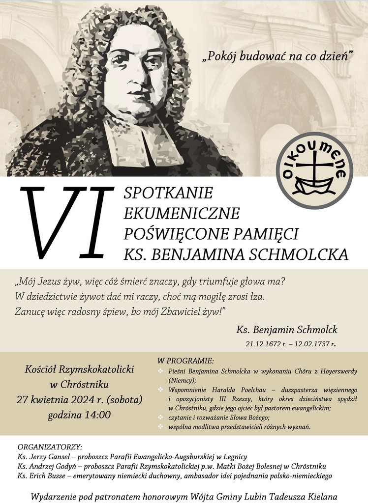 Pod hasłem „Pokój budować na co dzień” spotkają się już w sobotę 27 kwietnia wierni kilku wyznań w kościele rzymskokatolickim w Chróstniku. Tradycyjnie już wydarzenie organizowane jest pod honorowym patronatem wójta gminy Lubin Tadeusza Kielana.