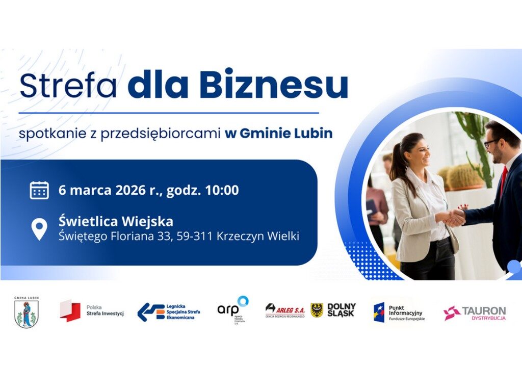 Legnicka Specjalna Strefa Ekonomiczna S.A. oraz wójt gminy Lubin zapraszają przedsiębiorców z regionu na bezpłatne spotkanie z cyklu „Strefa dla Biznesu”, które odbędzie się 6 marca (piątek) 2026 r. o godz. 10:00, w Świetlicy Wiejskiej, Świętego Floriana 33, 59-311 Krzeczyn Wielki.